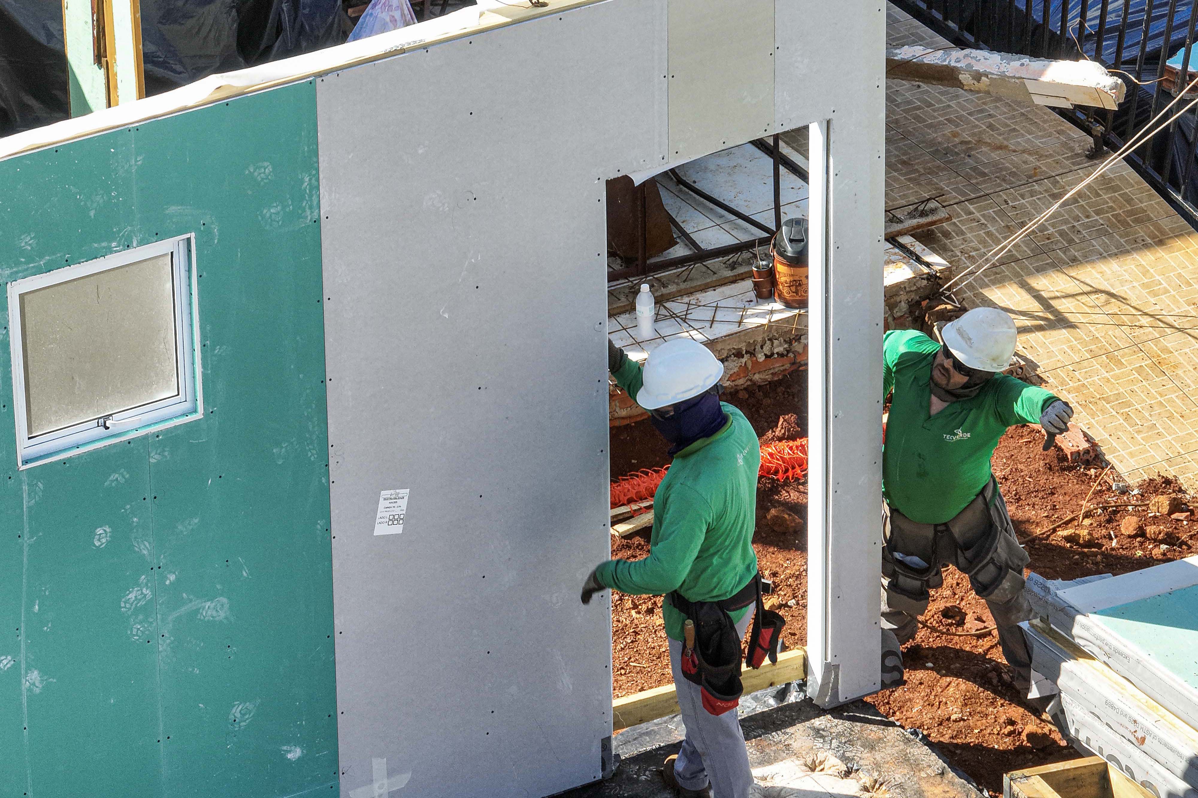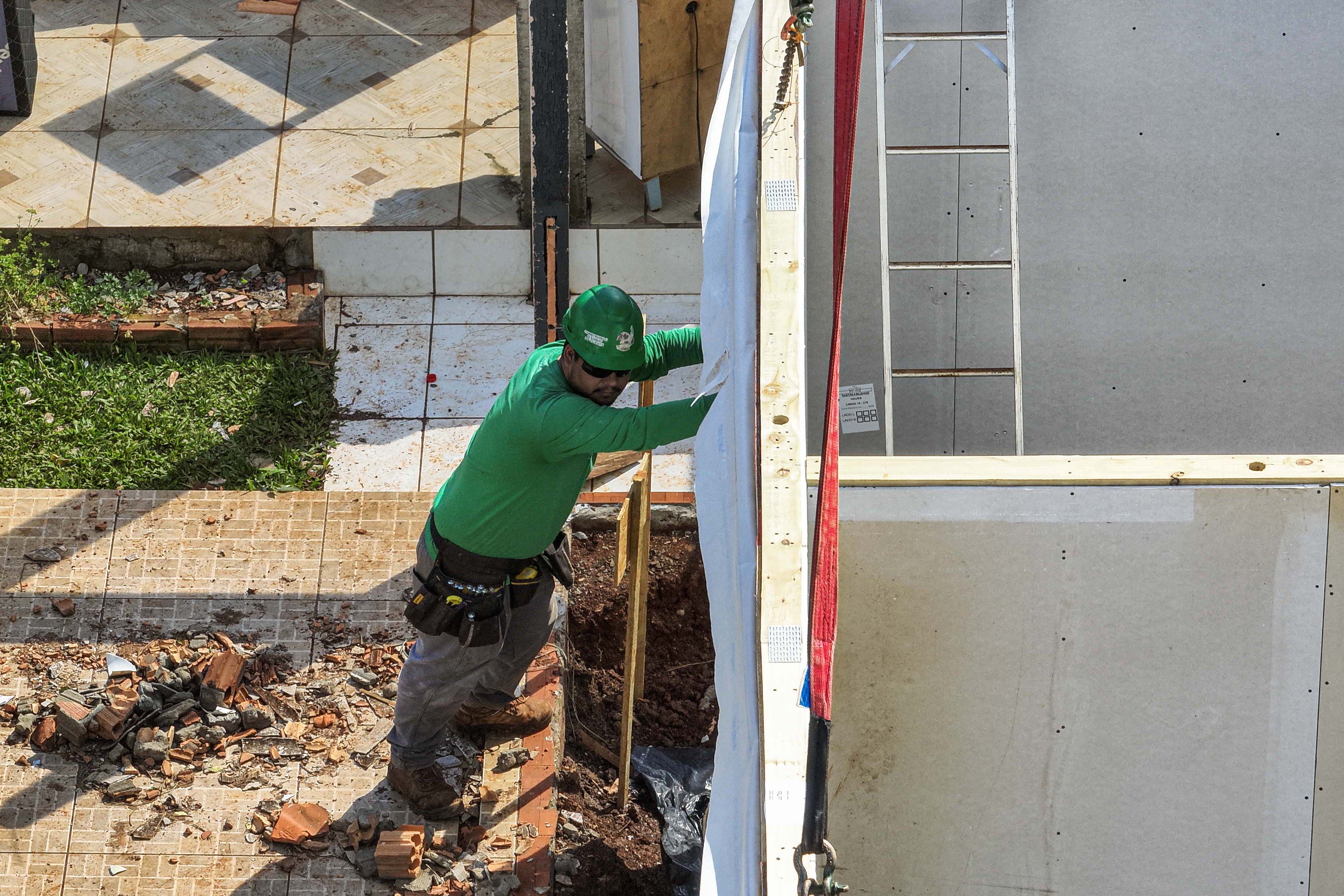 Na sequência, é iniciada a montagem da casa propriamente dita. As paredes chegam prontas e são encaixadas uma na outra. Esse processo leva, em média, 1h30. Essa rapidez é possível graças ao modelo construtivo das unidades. As casas são construídas no sistema light wood frame, que utiliza painéis de madeira engenheirada para formar a estrutura das paredes.