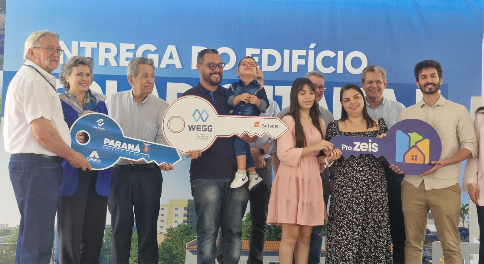 Nesta segunda-feira (13), a Companhia de Habitação do Paraná realizou a entrega de chaves dos 64 apartamentos do Residencial Soládio Itália II no município de Maringá. Nesta segunda fase do empreendimento, o investimento total supera a marca dos R$ 19,7 milhões e é resultado do esforço conjunto entre Governo do Estado, por meio do Programa Casa Fácil Paraná, Caixa Econômica Federal, Prefeitura Municipal e Construtora Wegg.