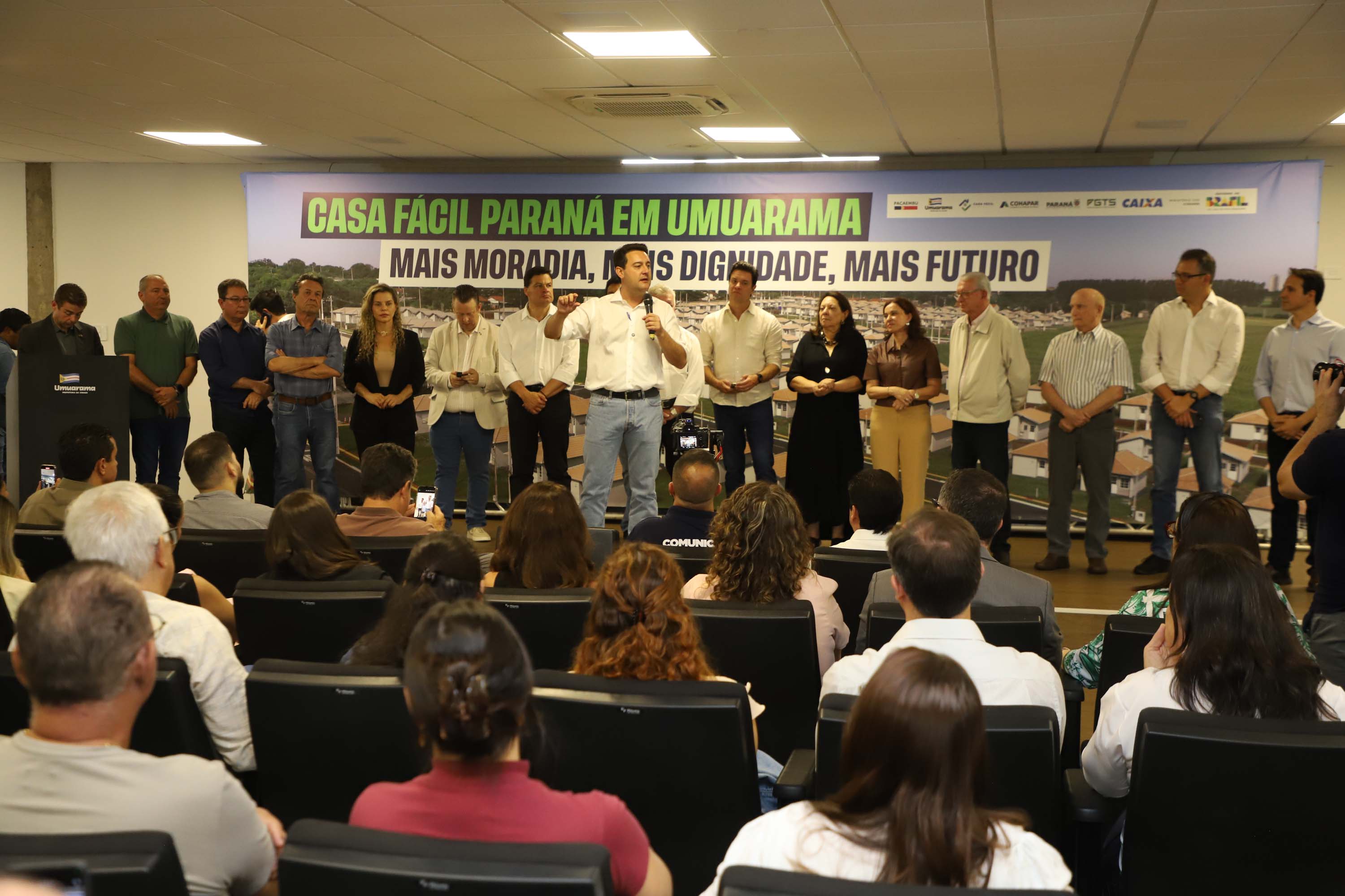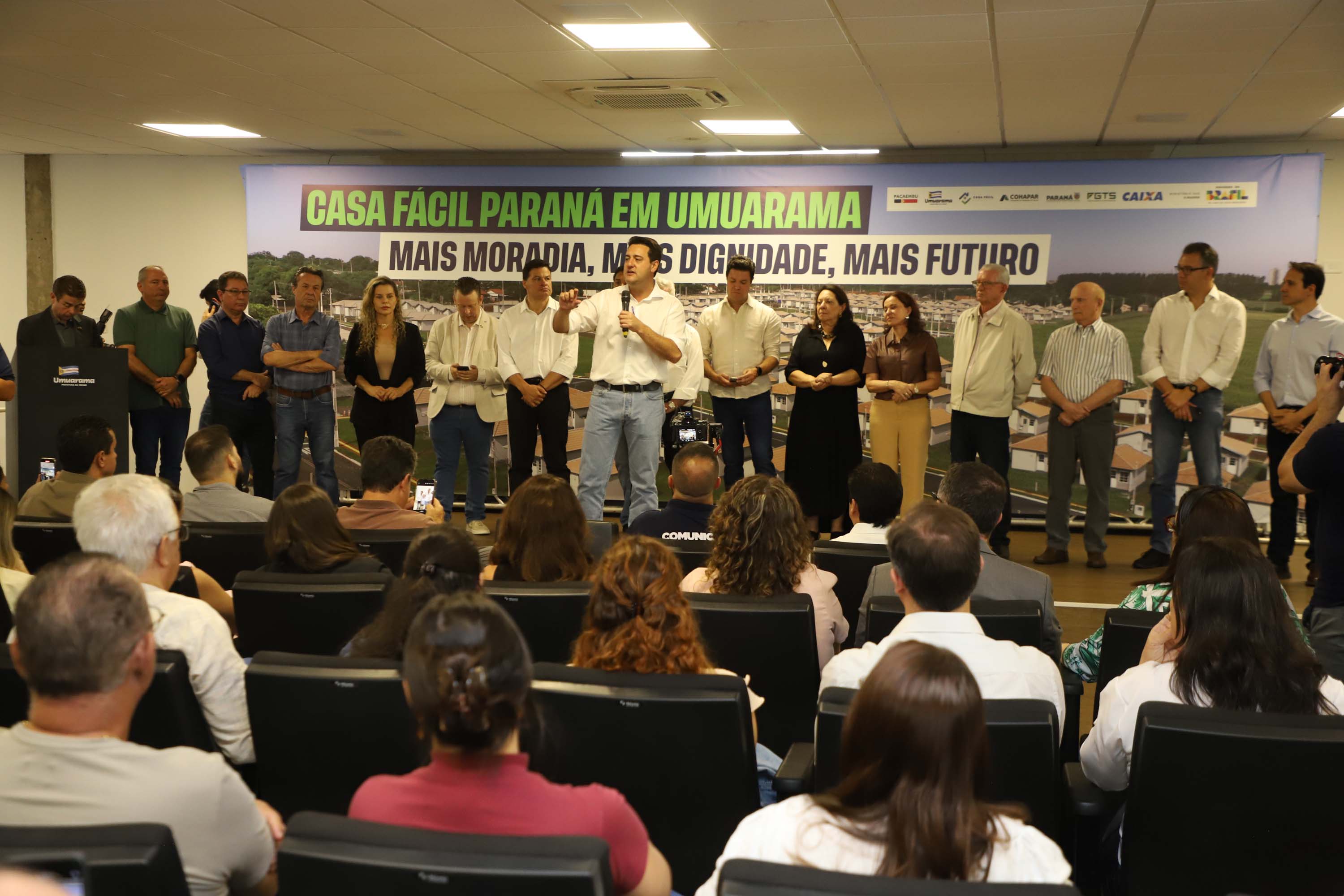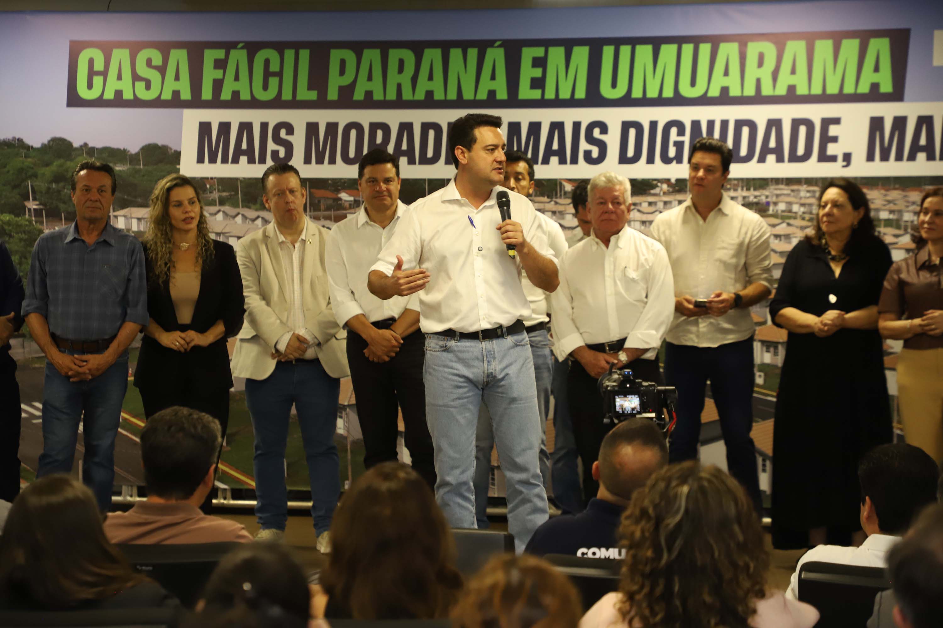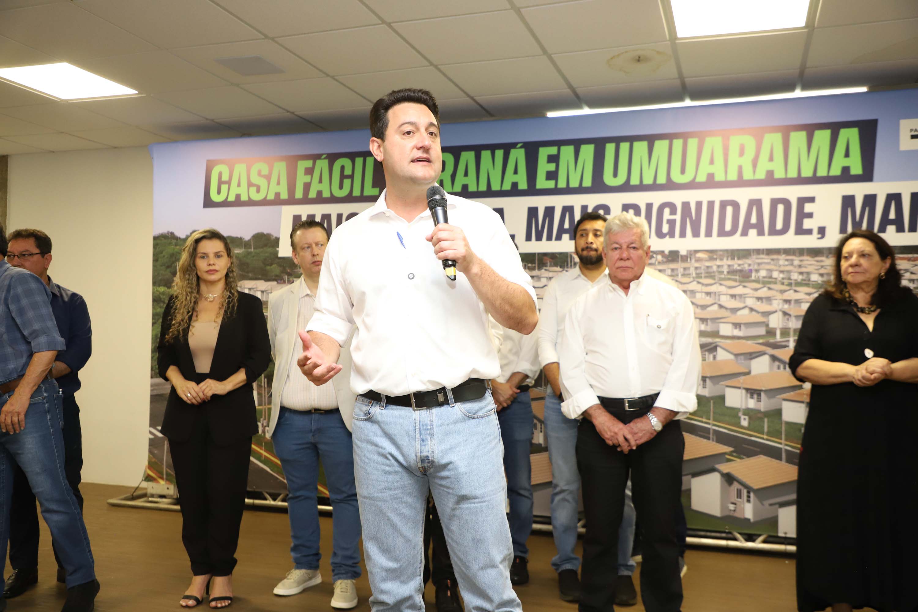 O governador Carlos Massa Ratinho Júnior anunciou nesta quarta-feira (17) a construção de 1.500 novas moradias em Umuarama, no Noroeste do Paraná. O empreendimento será executado pela construtora Pacaembu, com financiamento da Caixa Econômica Federal, e receberá cerca de R$ 30 milhões do Governo do Estado, por meio do programa Casa Fácil Paraná. Ele também inaugurou a unidade Poupatempo Paraná na cidade, a décima do Estado e a segunda da região Noroeste do Estado, depois de Maringá.