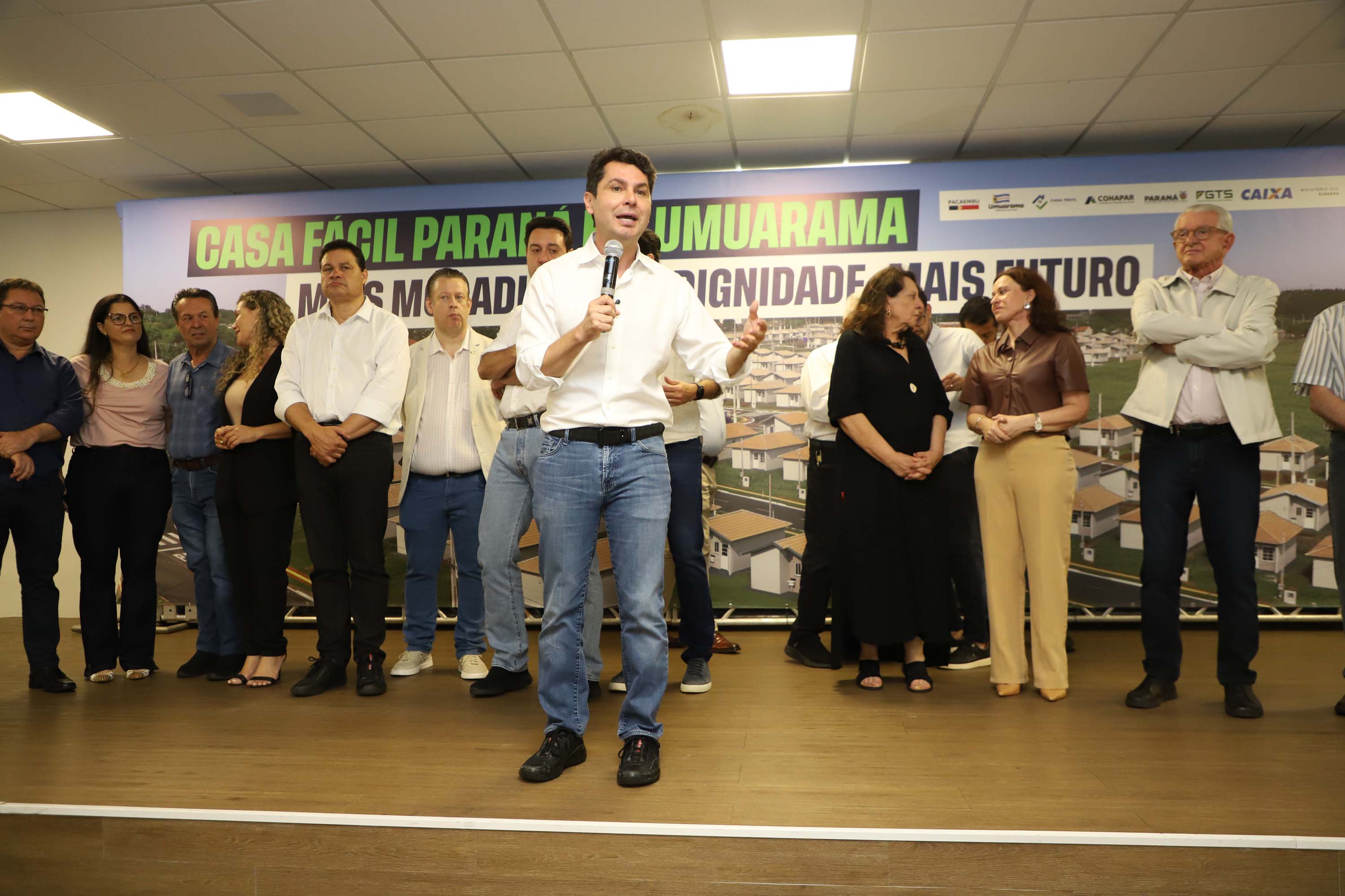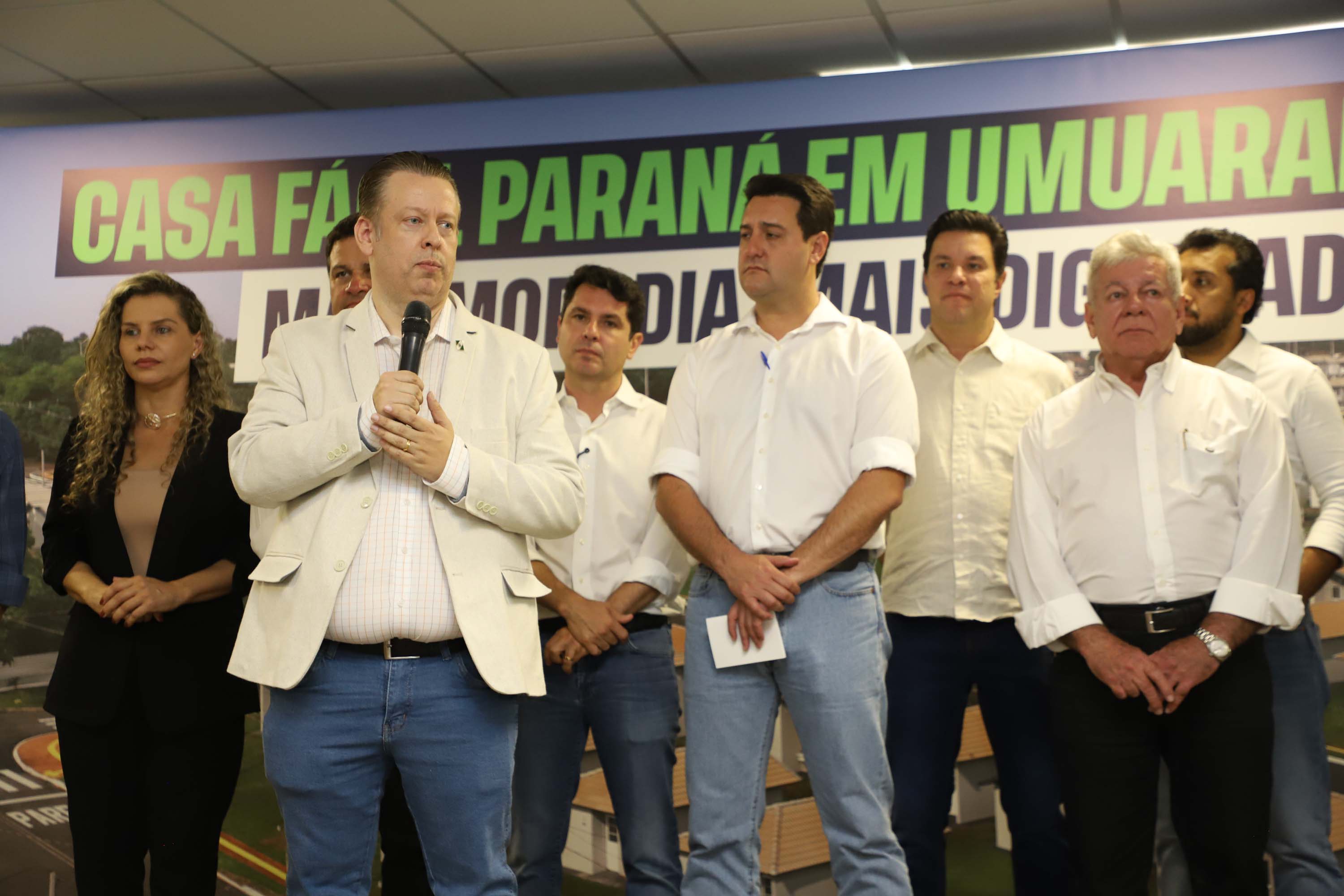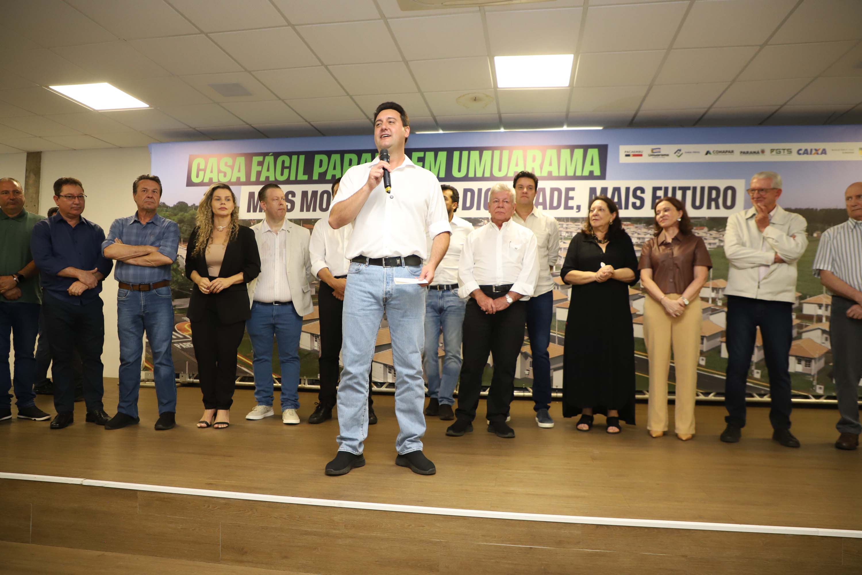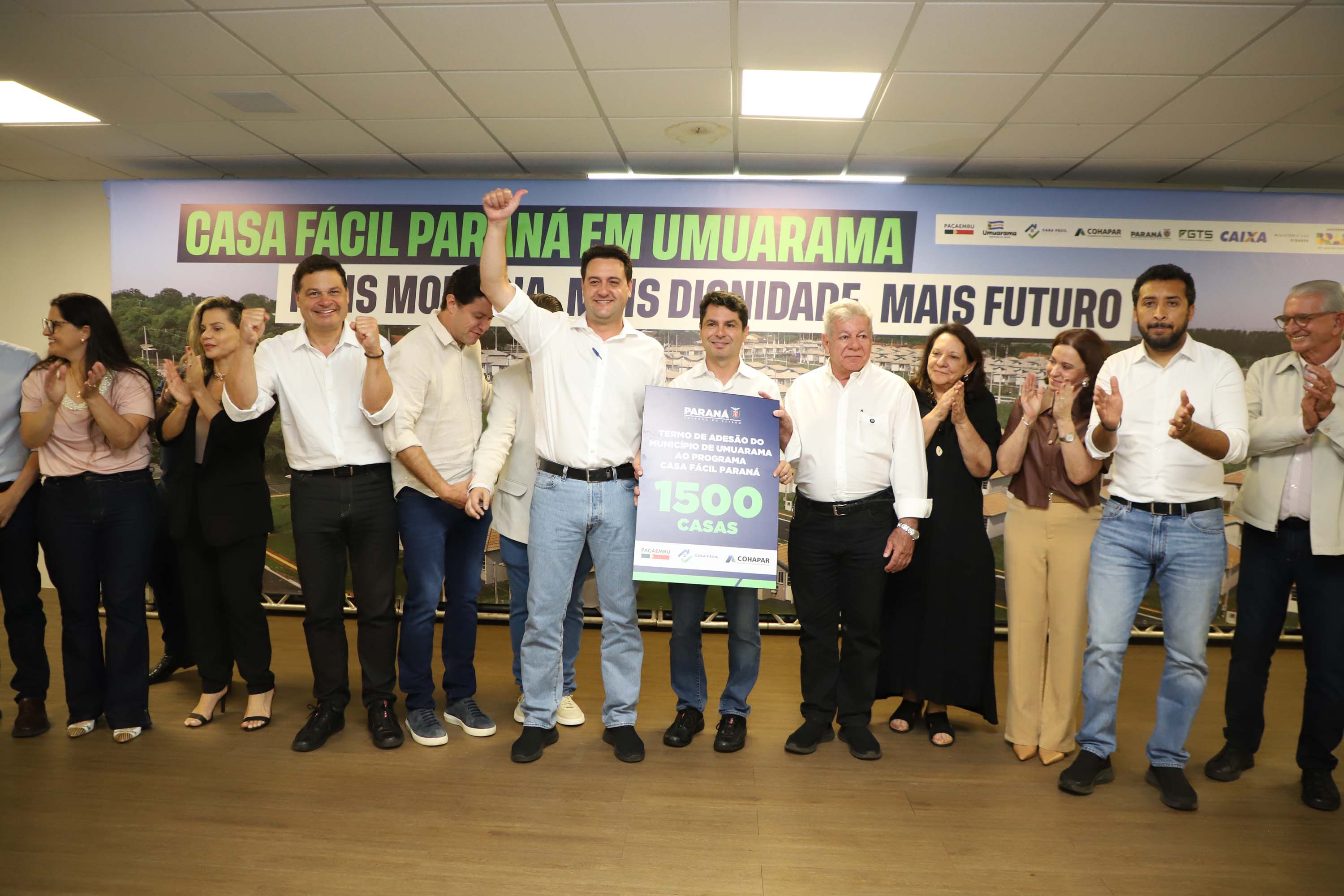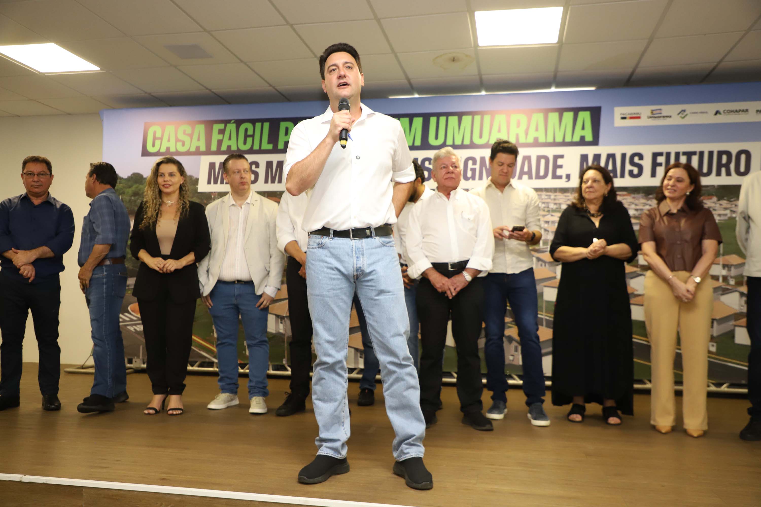 O governador Carlos Massa Ratinho Júnior anunciou nesta quarta-feira (17) a construção de 1.500 novas moradias em Umuarama, no Noroeste do Paraná. O empreendimento será executado pela construtora Pacaembu, com financiamento da Caixa Econômica Federal, e receberá cerca de R$ 30 milhões do Governo do Estado, por meio do programa Casa Fácil Paraná. Ele também inaugurou a unidade Poupatempo Paraná na cidade, a décima do Estado e a segunda da região Noroeste do Estado, depois de Maringá.