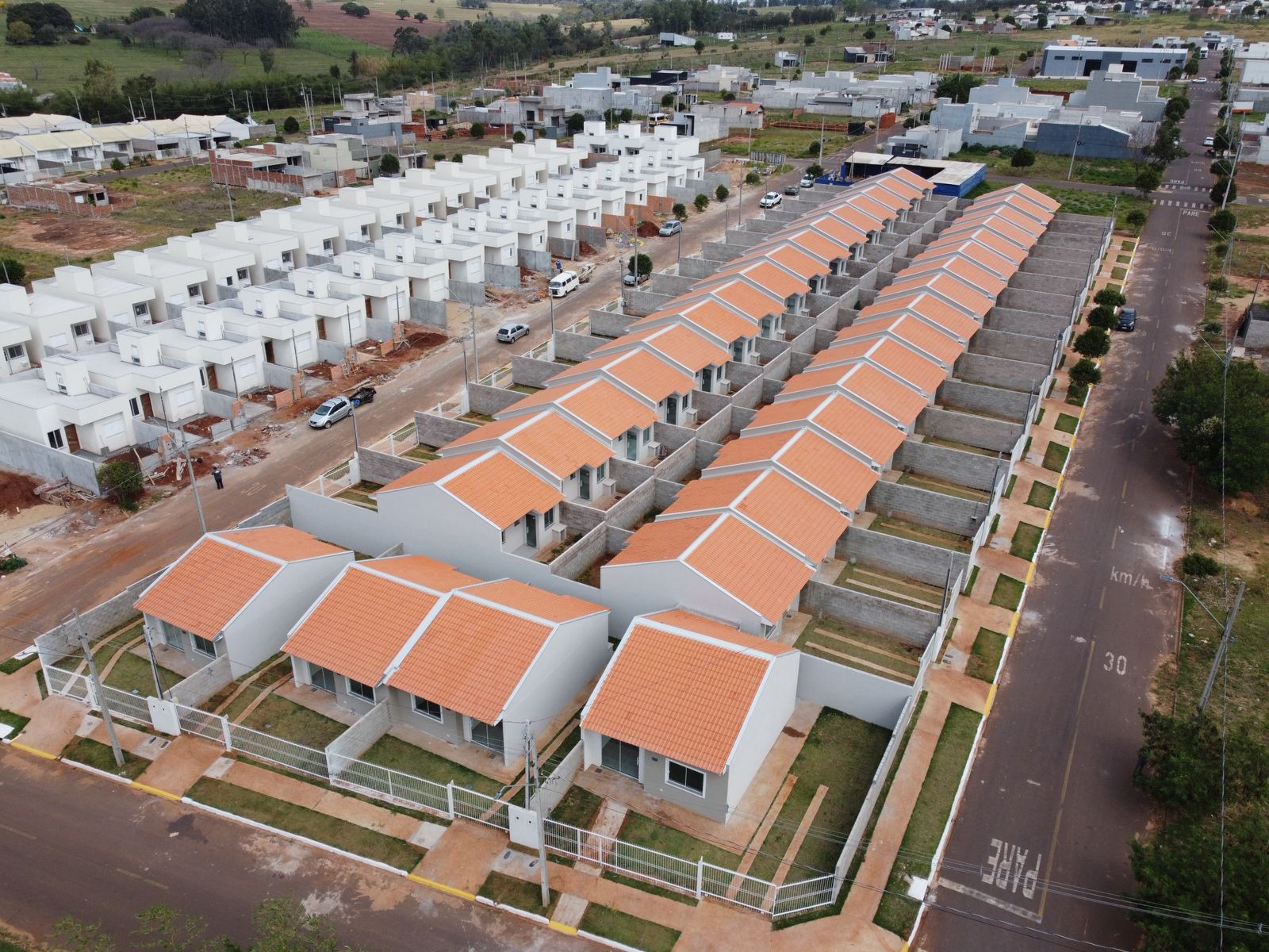 O modelo arquitetônico dos imóveis é padrão, formado por dois dormitórios, sala, cozinha, banheiro, área de serviço externa e espaço para garagem.