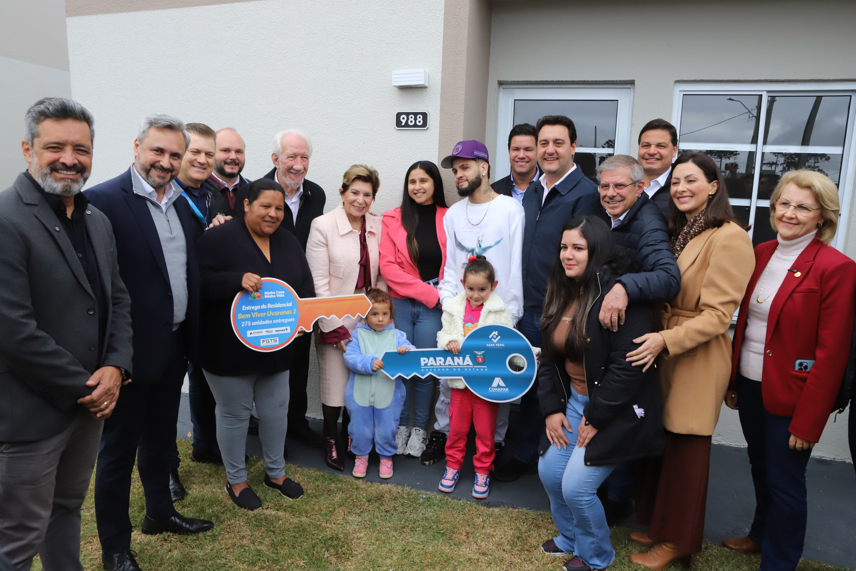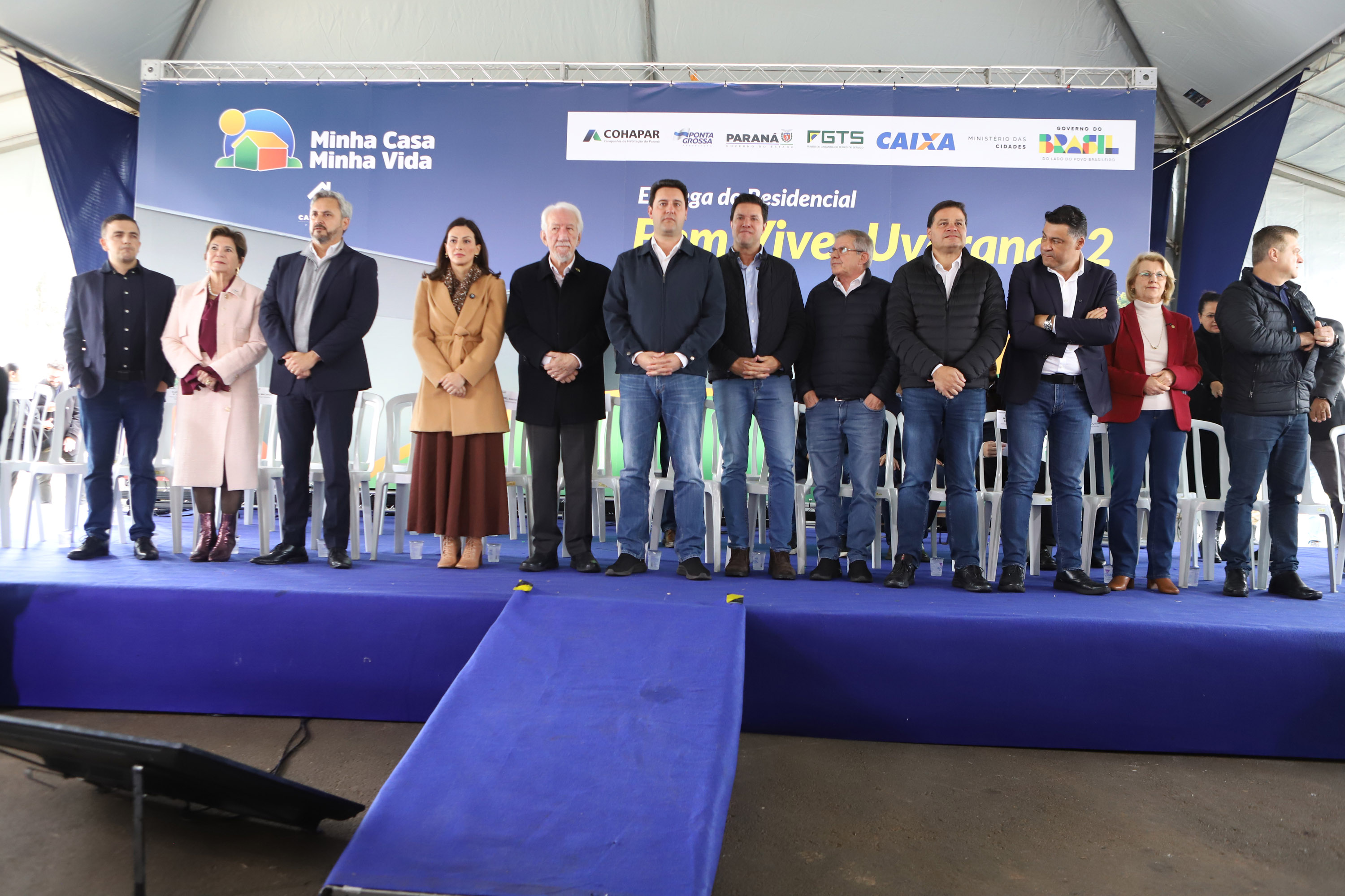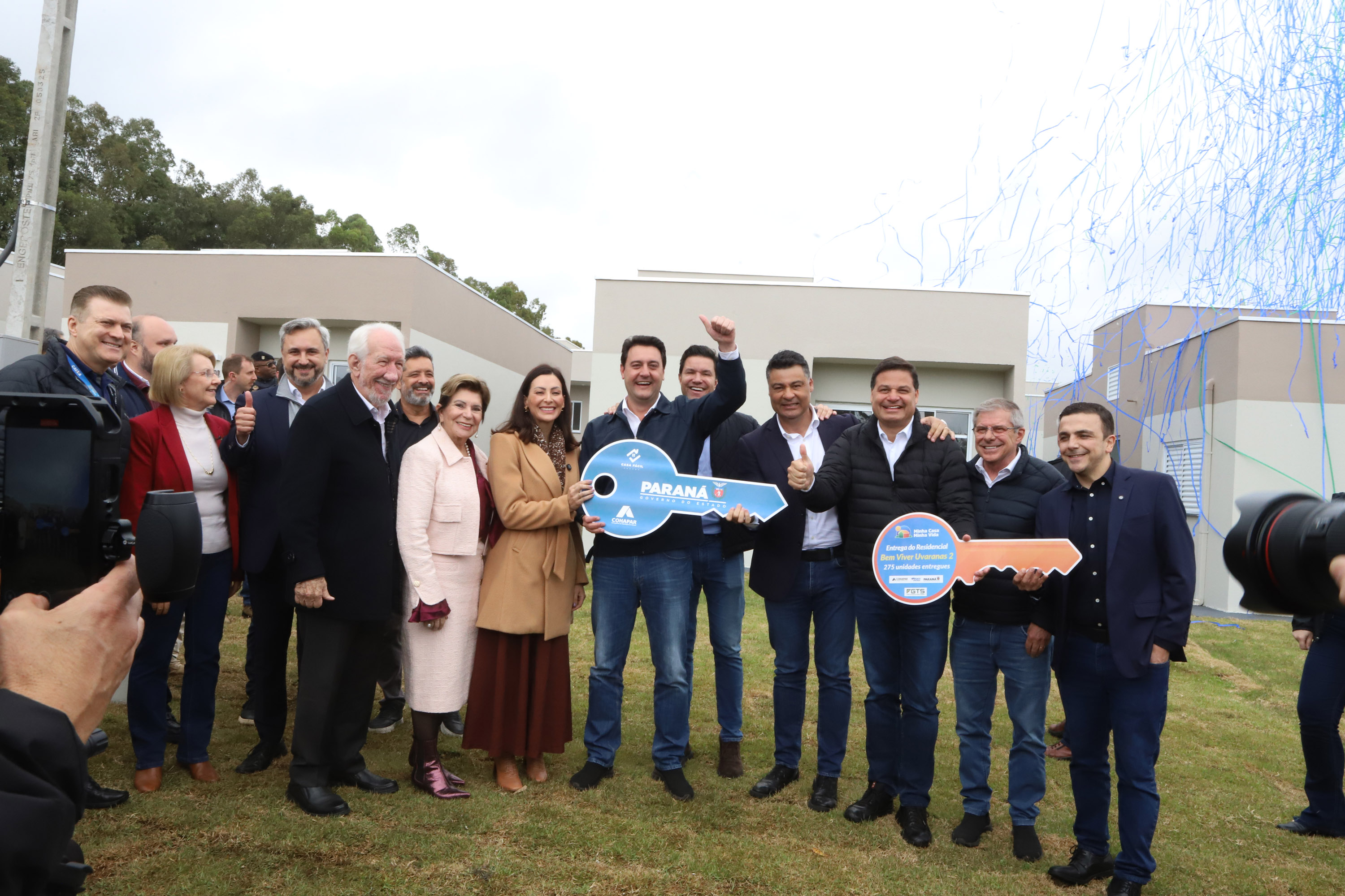 PRESENÇAS – Participaram da solenidade de entrega das casas em Ponta Grossa o vice-governador do Paraná, Darci Piana; o secretário de Estado de Infraestrutura e Logística, Sandro Alex; o diretor-presidente do DER, Fernando Furiatti; e o chefe da Casa Militar, coronel Tordoro. Também estiveram presentes o deputado federal Aliel Machado, e os deputados estaduais Mabel Canto, Márcia Huçulak, Fábio Oliveira e Marcelo Rangel; o CEO da Pacaembu Construtora, Fernando Almeida; o diretor de Negócios da empresa, Bruno Villar; o diretor de Engenharia, Marco Cury; o superintendente de Rede da Caixa Econômica Federal, Gilberto Onofre da Luz; e a superintendente de Habitação da Caixa, Vanessa Maria Kozicki; o vice-prefeito de Ponta Grossa, pastor Moisés Faria; o prefeito de Sengés, Gerson; o reitor da Universidade Estadual de Ponta Grossa (UEPG), Miguel Sanches.