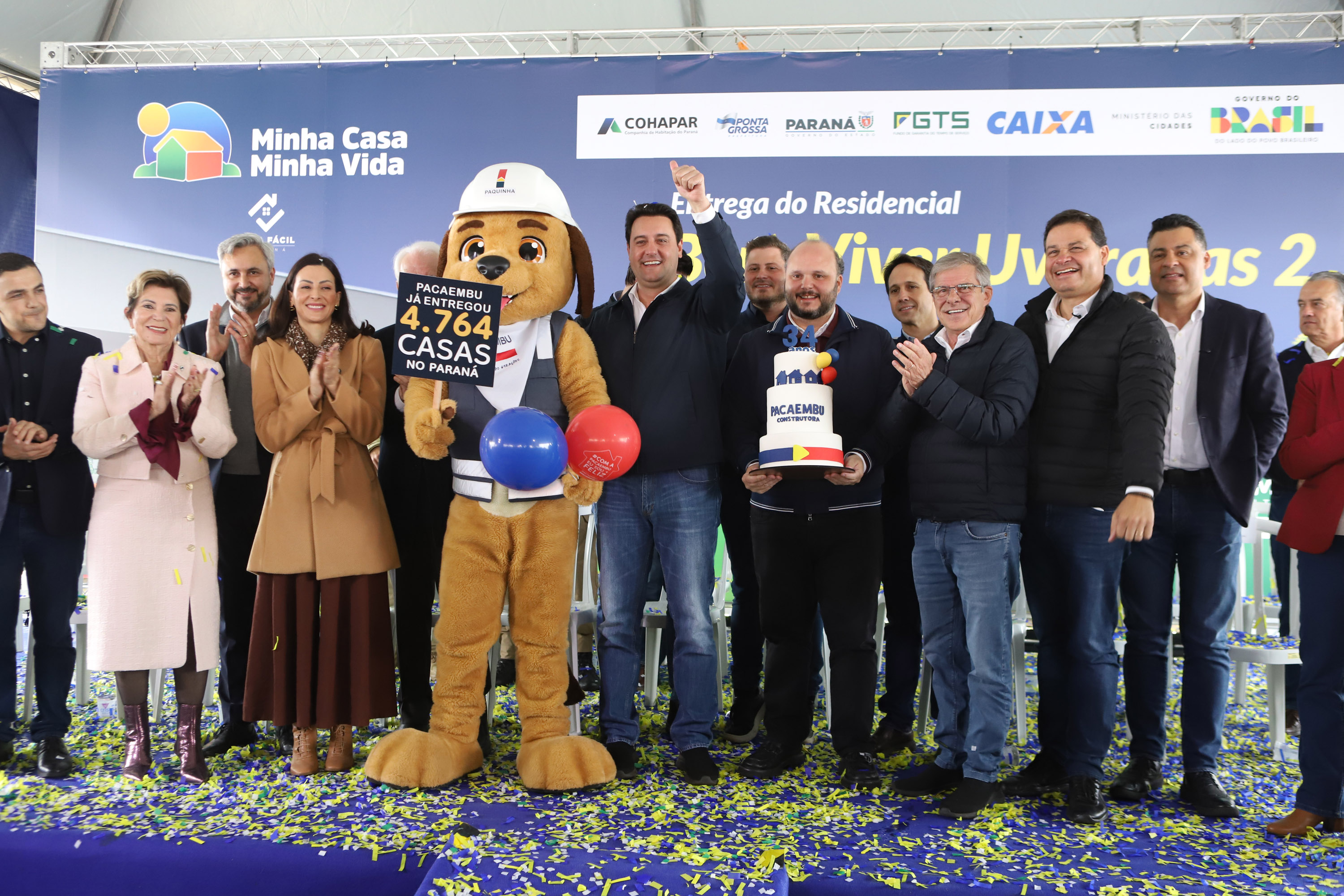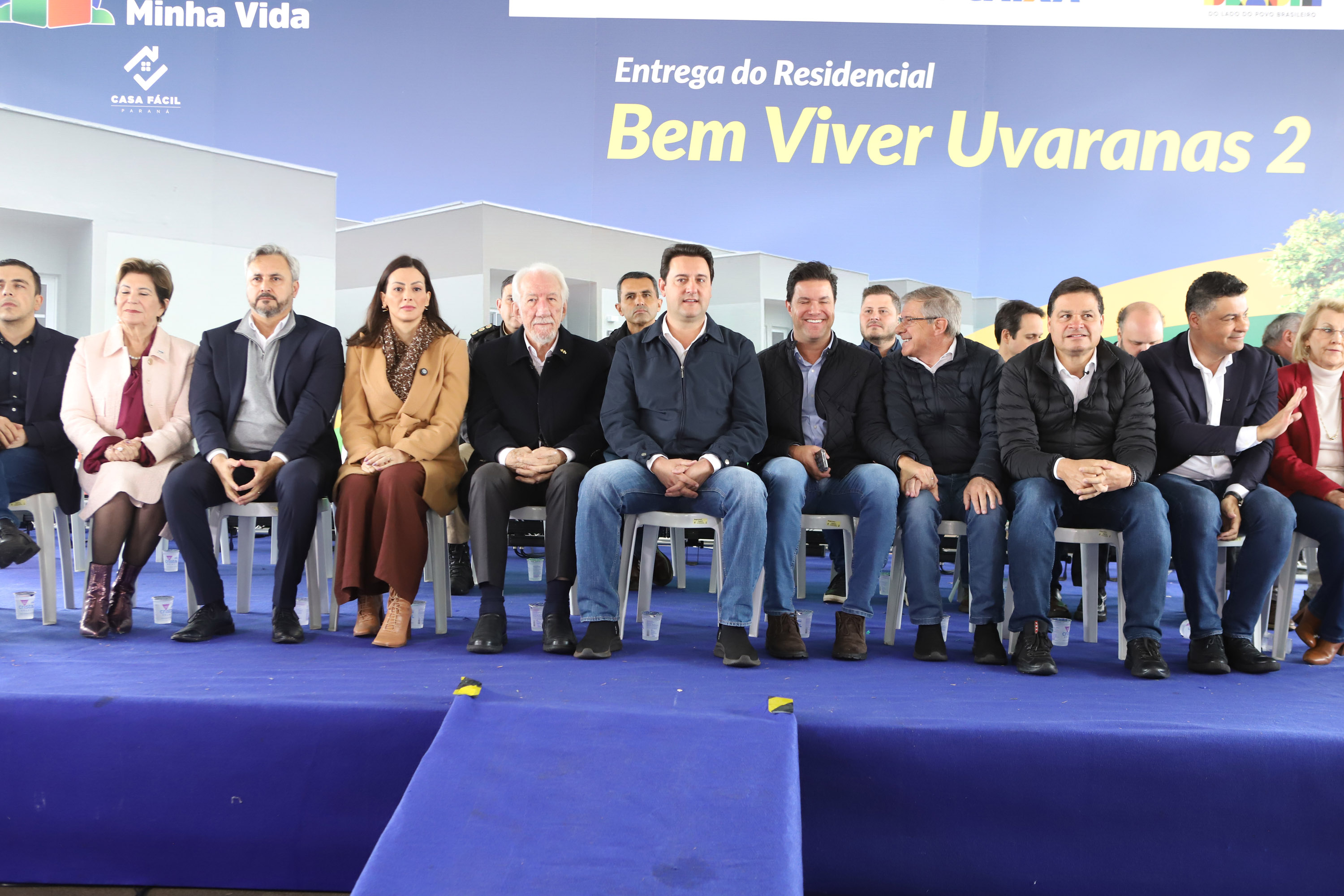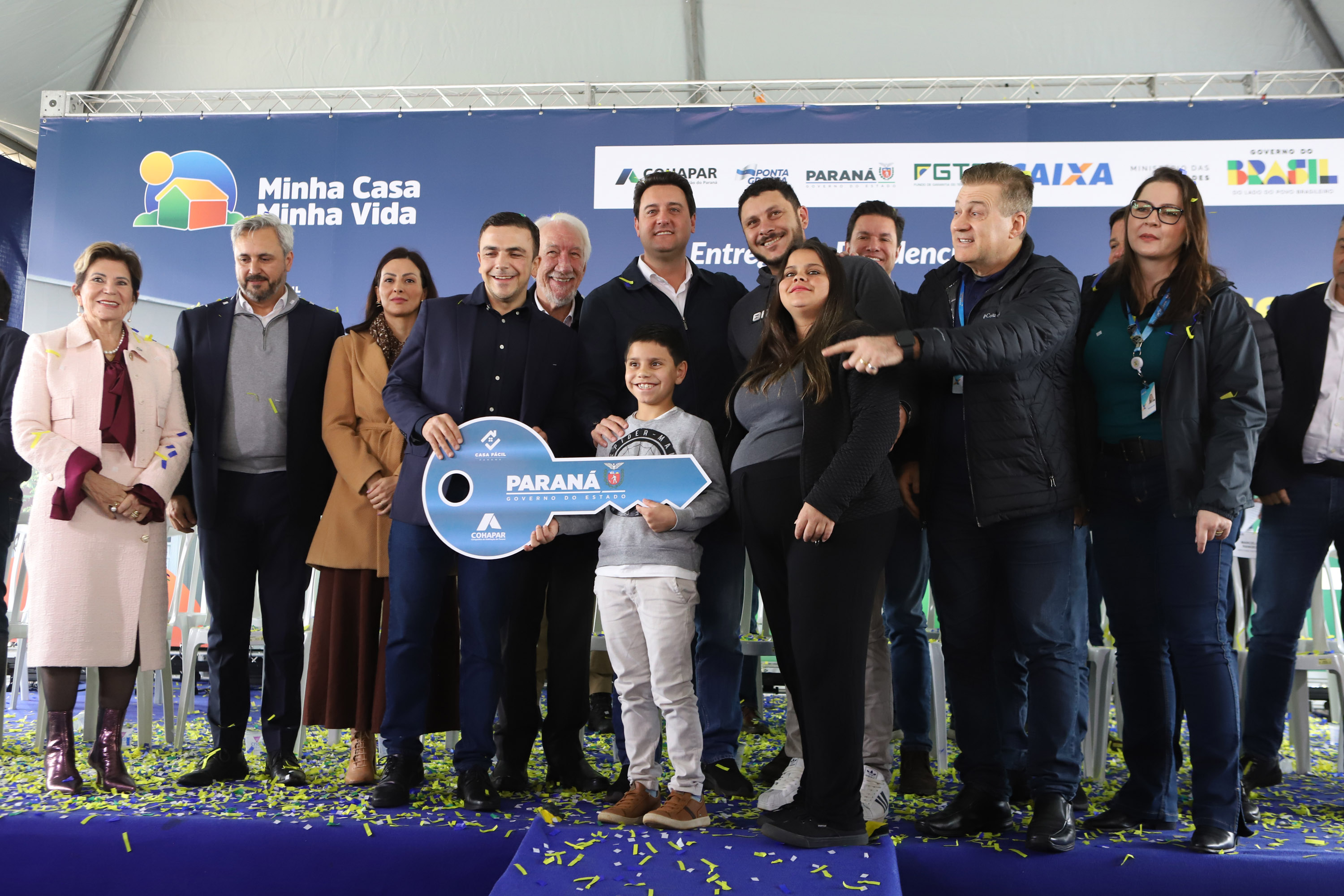 PRESENÇAS – Participaram da solenidade de entrega das casas em Ponta Grossa o vice-governador do Paraná, Darci Piana; o secretário de Estado de Infraestrutura e Logística, Sandro Alex; o diretor-presidente do DER, Fernando Furiatti; e o chefe da Casa Militar, coronel Tordoro. Também estiveram presentes o deputado federal Aliel Machado, e os deputados estaduais Mabel Canto, Márcia Huçulak, Fábio Oliveira e Marcelo Rangel; o CEO da Pacaembu Construtora, Fernando Almeida; o diretor de Negócios da empresa, Bruno Villar; o diretor de Engenharia, Marco Cury; o superintendente de Rede da Caixa Econômica Federal, Gilberto Onofre da Luz; e a superintendente de Habitação da Caixa, Vanessa Maria Kozicki; o vice-prefeito de Ponta Grossa, pastor Moisés Faria; o prefeito de Sengés, Gerson; o reitor da Universidade Estadual de Ponta Grossa (UEPG), Miguel Sanches.